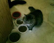 Satin & Shadow love to play with this feather toy. Satin looks a lot like Shadow so mommy put a collar on Satin. We often call Satin Shadow's mini me. Satin is actually Blackberry's litter mate but she has long, fluffy fur like Shadow. I really love my ninja sisters.