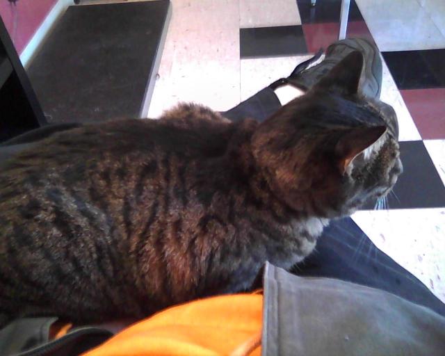 why is either one of them on his lap? that's my lap to sleep on. I used to share with the other shed cats, but now that lap is MINE.