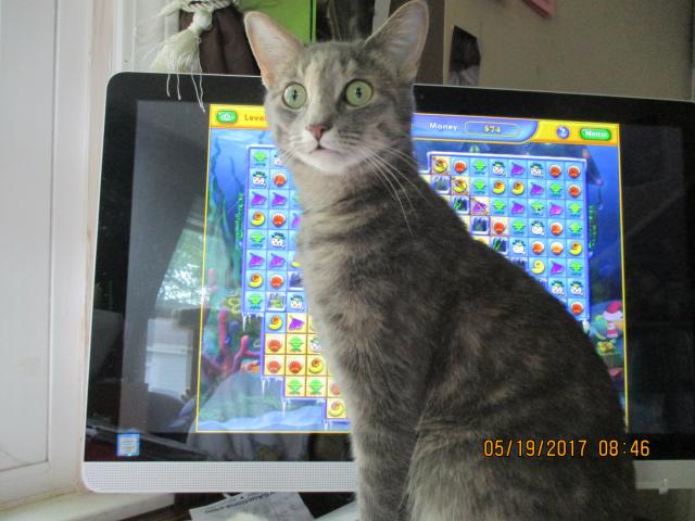 I was helping mom play her game when I heard a SCARY NOISE!! It went away and I went back to helping mom play her game but I was annoyed that someone had bother me!! Kitty Kisses from Seshat and Kephri