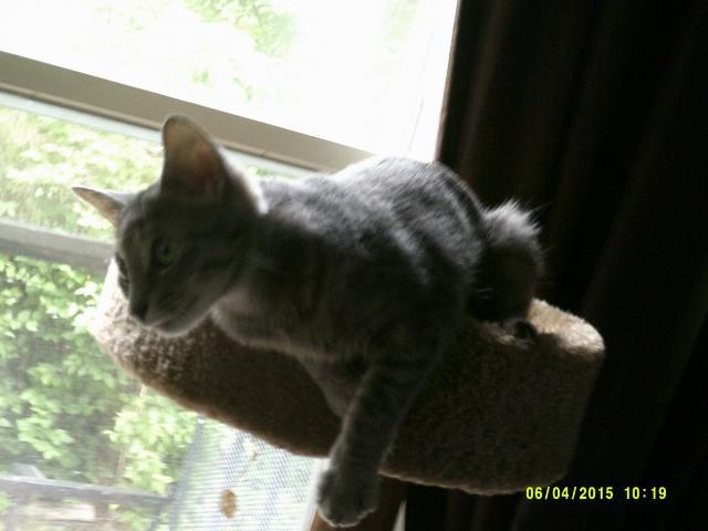 Seshat: NO-NO GET DOWN keeps trying to pull my stitches out!! I jumped on the bed, the couch, the dresser, the counter and now I'm in my tree. Mom says she is going to have to put that blow up collar on if I don't settle down...Catch me first mom!!! That NO-NO GET DOWN is a bad influence.