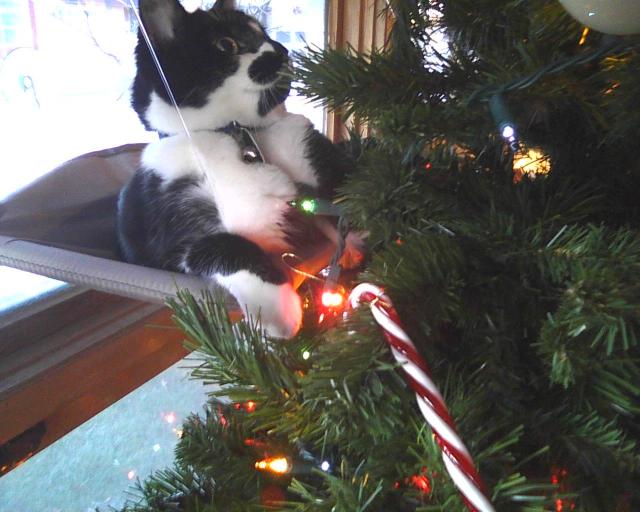 That looks like it would be a fun tree to climb on Binx. Mommy put up a small tree on the long counter in her kitchen. We kitties already knocked it over twice. I suspect it was my sissy fur Blackberry. The tree is one of those small fiber optic trees and mommy has not hung any breakable decorations on it this year. Our big Christmas tree is still in its box and mommy says she might not put it up. It got knocked down several times last year and several of the tree decorations got broken. If she puts it up she says she might have it up just before Christmas so we kitties will not have time to tear it up too badly this year. I'll try to be good but I still would not trust my sissy fur Blackberry.